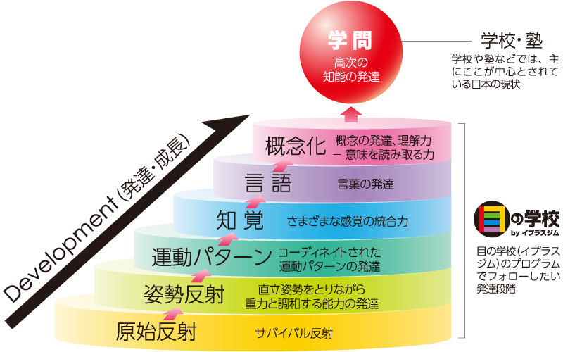 図のような発達の順序を守る事は非常に大切です。 からだの運動パターンの発達がいかに「言語」や「思考」「概念化」といった、いわば学校での勉強の基礎になるかがこの図からわかります。 つまり勉強の苦手な子どもに、勉強だけを強いるのではなく、「目の学校」のプログラムをプラスすることによって結果「勉強ができる」という方向にシフトする事が可能となります。